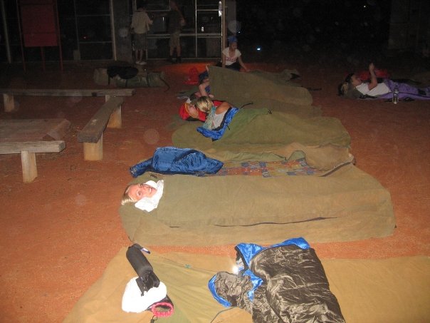 Now I use the term ‘camping’ in the loosest sense of the word, since we had no tents; we were just lying in a row in our sleeping bags directly on the dry and cracked red earth, hiking boots tucked inside our sleeping bags so that they wouldn’t be stolen in the night by the circling dingos, who sporadically startled us with piercing cries.