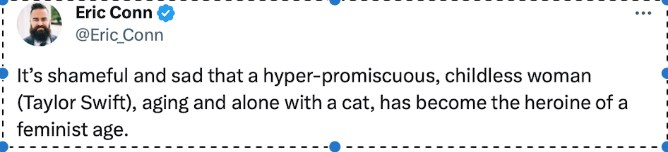 Wow. It’s almost 2024 and there are still people out there who believe that a woman without a husband and children is ‘shameful and sad’? Seriously? I mean, never mind that she’s worth $1.1billion, has almost 100m followers on the very platform he’s slating her on (next to Conn’s paltry 24k) and is one of the most successful entertainers of all time; the fact that she’s not yet made use of her uterus (and may never, who knows?) means she’s fair game? A deserving punchbag for this kind of abuse?